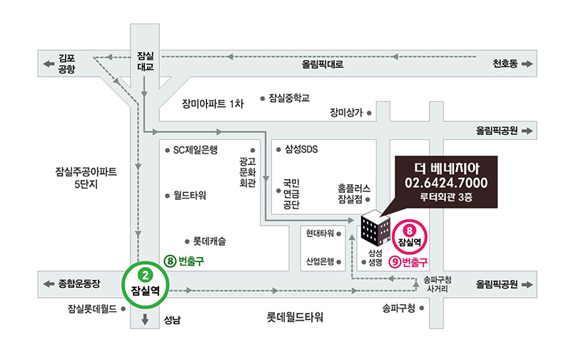 더베네치아 오시는 길 The Venezia Location 더베네치아에 찾아 오시는길을 안내해 드립니다. Address_ 서울시 송파구 올림픽로35다길 42 (신천동 7-20번지) 루터회관 3층 더베네치아 / Tel_ 02-6424-7000 네이버 빠른길 찾기 지도 크게 보기 더베네치아 The Venezia Subway 지하철 2호선 잠실역 → ⑧번 출구 하차 도보 2분거리 8호선 잠실역 → ⑨번 출구 하차 도보 1분거리 Bus 버스 잠실역 정류장 하차 간선버스 : 302, 303, 320, 341, 342 지선버스 : 2412, 2415, 3215, 3216, 3313, 3315, 3318, 3319, 3411, 3412, 3413, 3414, 4318, 4319 좌석버스 : 500-1, 1000, 1001, 1007, 1007-1, 1009, 1100, 1112, 1115, 1115-6, 1115-7, 1117, 1200, 1650, 1670, 1700, 2000, 5600, 5800, 6900, 7007, 8001, 8002, 9005 공항버스 : 6006 일반버스 : 30-1, 30-3, 30-5, 70 네이버 실시간 버스노선 → Car 자가용 네비게이션 : "더베네치아" 또는 "한국루터회관" 입력 네이버 빠른길 찾기 명칭검색 : "더베네치아" 또는 "한국루터회관" 입력 주소 : "서울시 송파구 올림픽로35다길 42" 또는 "서울시 송파구 신천동 7-20" 입력 약도 인쇄 및 다운로드 약도 인쇄하기 약도 다운로드(PDF) Parking Lot 주차장 루터회관 지하주차장 이용, 주차요원의 안내를 받으세요. Address 도로명 주소 : 서울시 송파구 올림픽로35다길 42 루터회관 3층 더베네치아 지번 주소 : 서울시 송파구 신천동 7-20번지 루터회관 3층 더베네치아 Tel 02-6424-7000 Fax 02-6424-7007