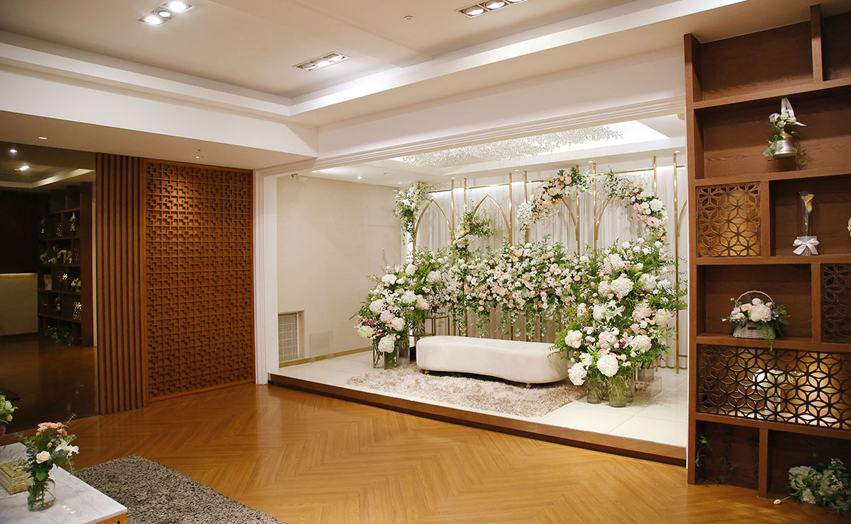Bride Room 신부대기실 신부를 위한 더 특별한 공간 신부의 아름다움이 완성되는 곳, 오직 신부님만을 돋보이는게 하는 신부대기실은 설레이는 순간을 편안한 마음으로 기다릴수 있는 공간입니다. 신부대기실은 모던스타일의 우아하고 감각적인 인테리어로 준비되었습니다. 그날의 주인공인 신부님의 아름다운 자태를 더욱 빛나게해드립니다.